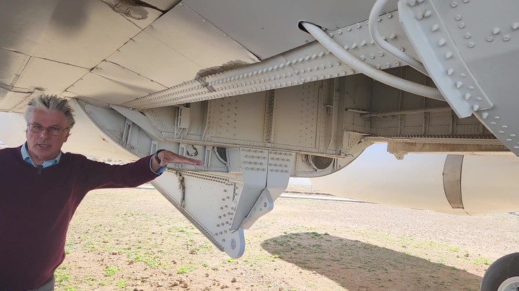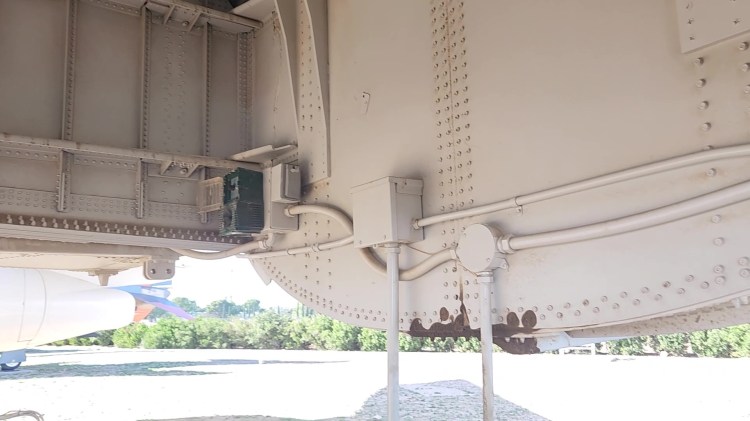 NASA hacked an enormous bay carved out of her fuselage, right between the main landing gear. That bay, which looks kind of Frankensteined together, is where they wedged the Enterprise landing gear assembly. Her own main gear was still intact, but she actually took off and landed on the shuttle gear.